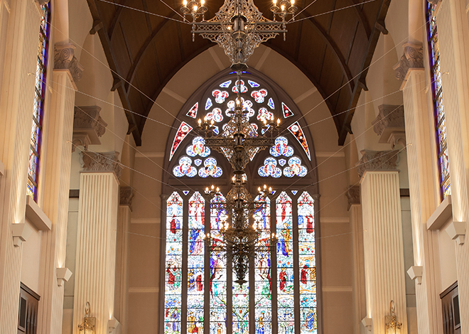 二人の誓いを見守るのは、バージンロードの先にある壮大なステンドグラス。