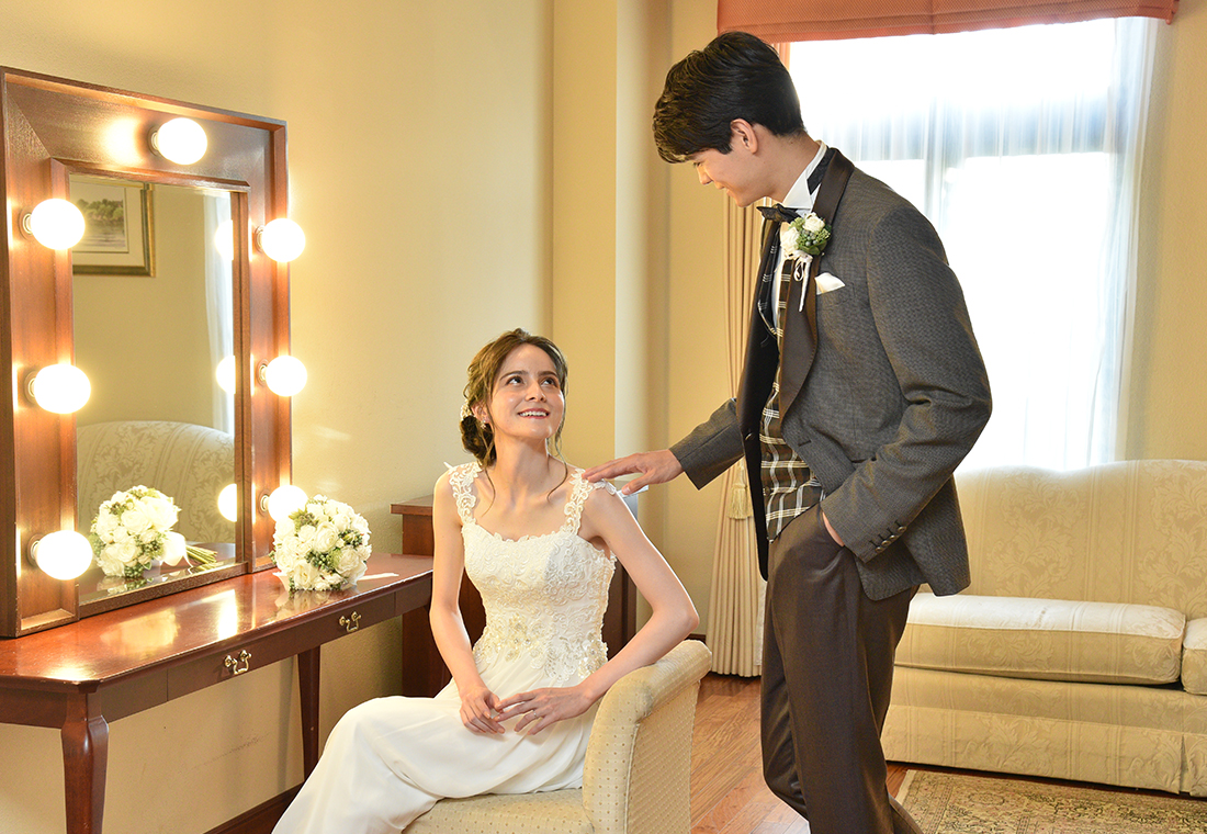 結婚式当日に新婦新婦が身支度をするための専用の部屋、ブライズルーム。特別な1日をお過ごしいただけるように、そして挙式やパーティ前の緊張が、やわらぐよう落ち着いたトーンのインテリアにしています。