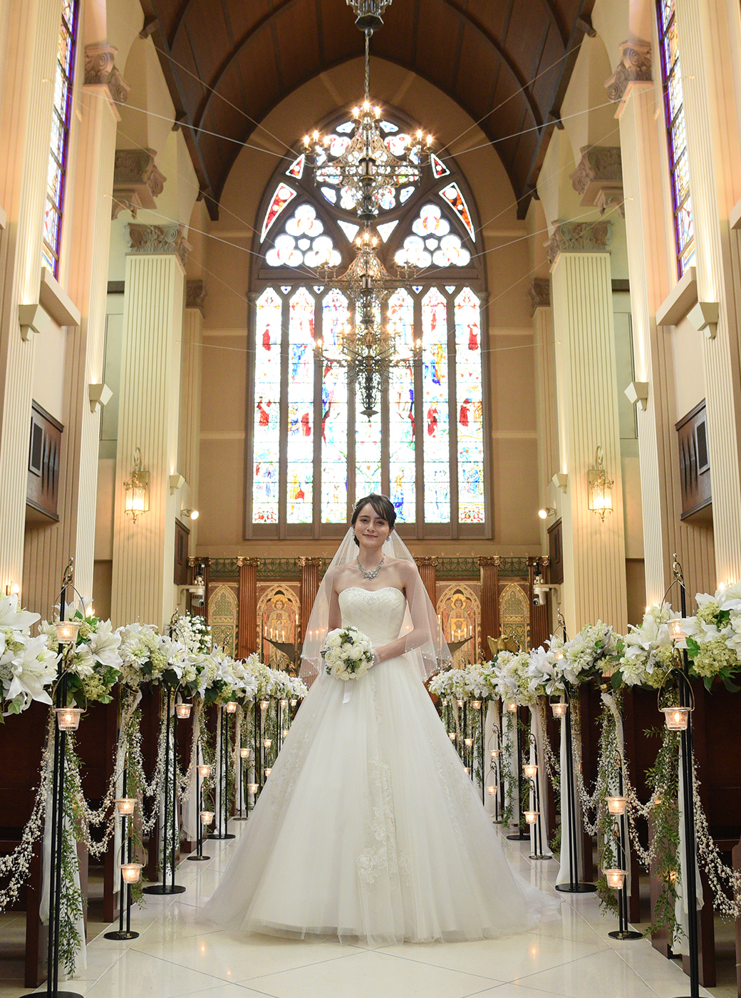 色鮮やかなステンドグラスから、柔らかな光が差し込み、ウエディングドレス姿の花嫁は神秘的な美しさを放ちます。