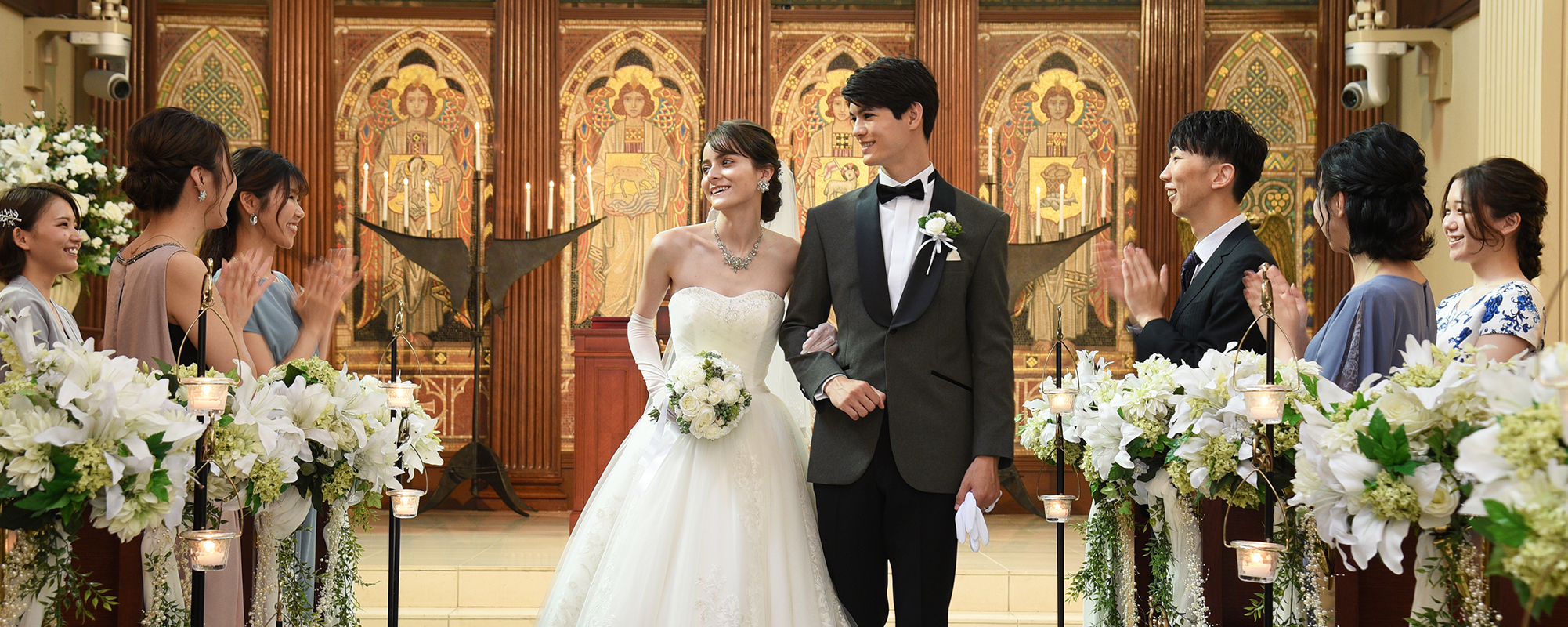 オルガニスト、フルート、コーラスの5名編制で、入場から退場まで、音楽はすべて生演奏。聖歌隊が織りなす祝福のハーモニーが大聖堂を包み、おふたりや列席の方々の思い出に残るワンシーンを演出します。
