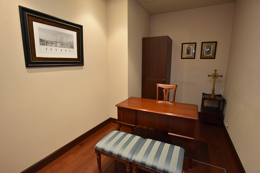 挙式当日に、新郎新婦がこの部屋で牧師と打ち合わせをします。牧師は、おふたりとの会話を通して緊張をほぐすのと同時に、挙式でおふたりに贈る最適の言葉を見つけます。