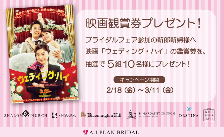 第一弾は2022年2月18日(金)~3月11日(金)の期間中、各式場のブライダルフェアにご参加いただくか、DESTINAでブライダルフェアのご予約かフォトプランをお申込み、またはブライズなびにご来店いただいたお客様の中から抽選で、合計5組10名様に映画「ウェディング・ハイ」の観賞券をプレゼントいたします!